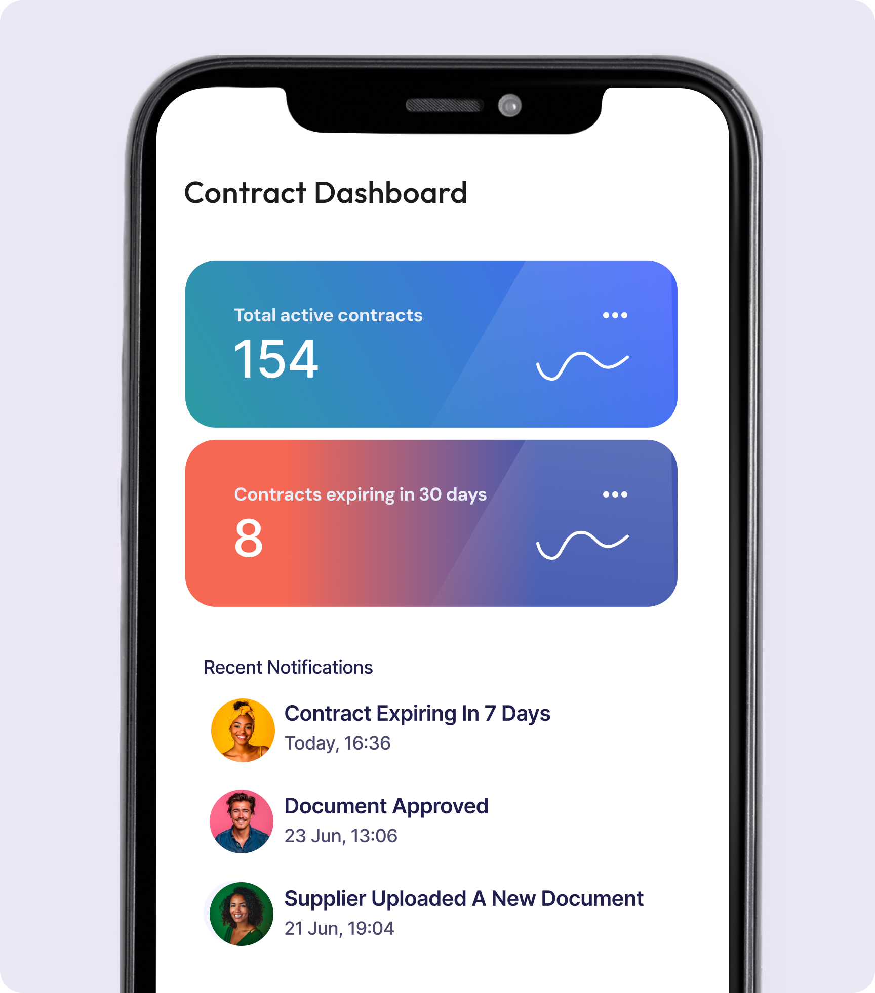 Every contract record holds its documents, key dates, approvals, and history together — not scattered across drives, inboxes, or trackers
