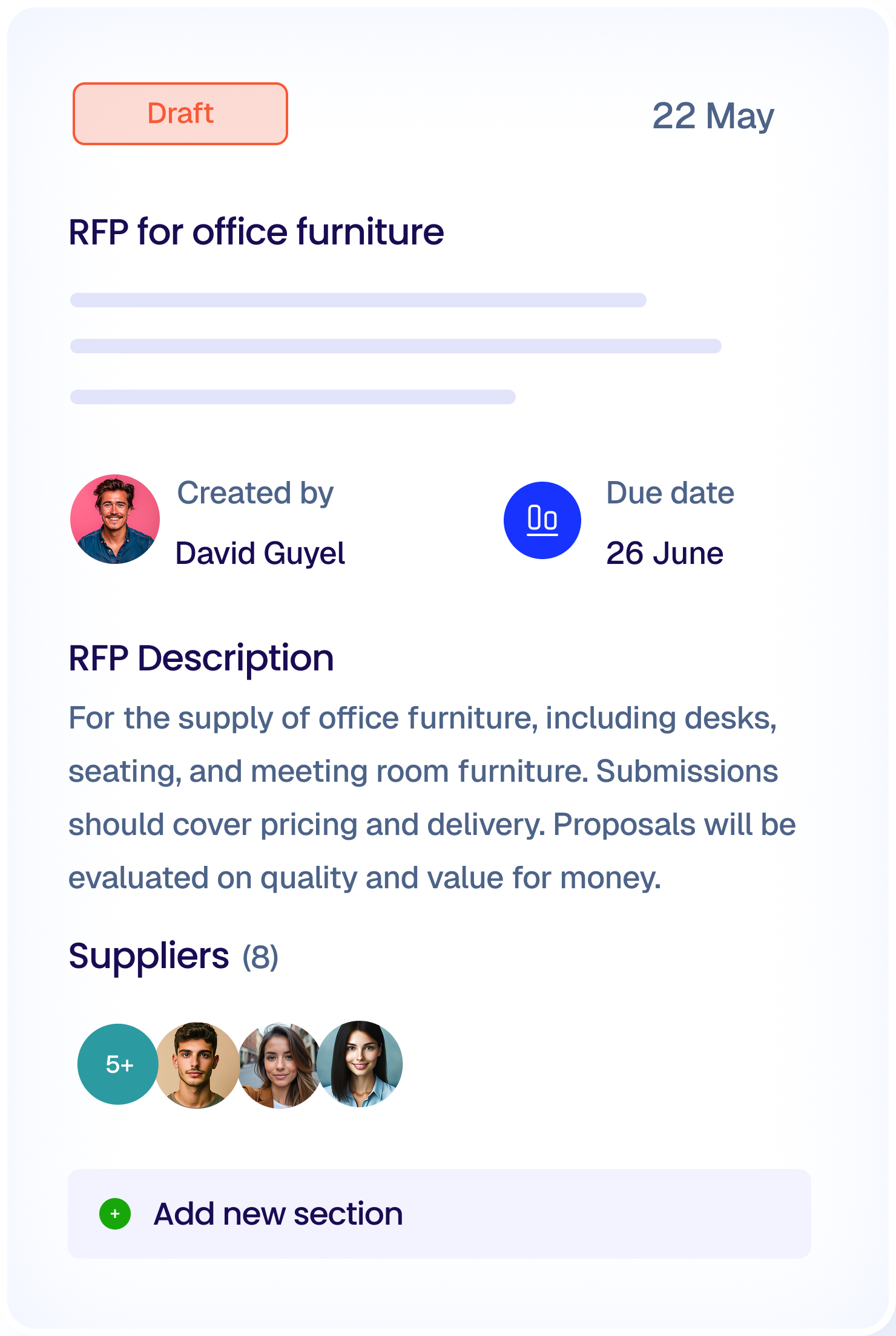 Build your RFPs, RFQs, and RFIs exactly how you want them in minutes. Search sections, insert them, and send.
