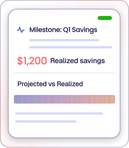 Milestones create a clear trail from baseline spend to projected savings to realized delivery. Every change, completion, and value is recorded, making savings easy to defend during reviews.